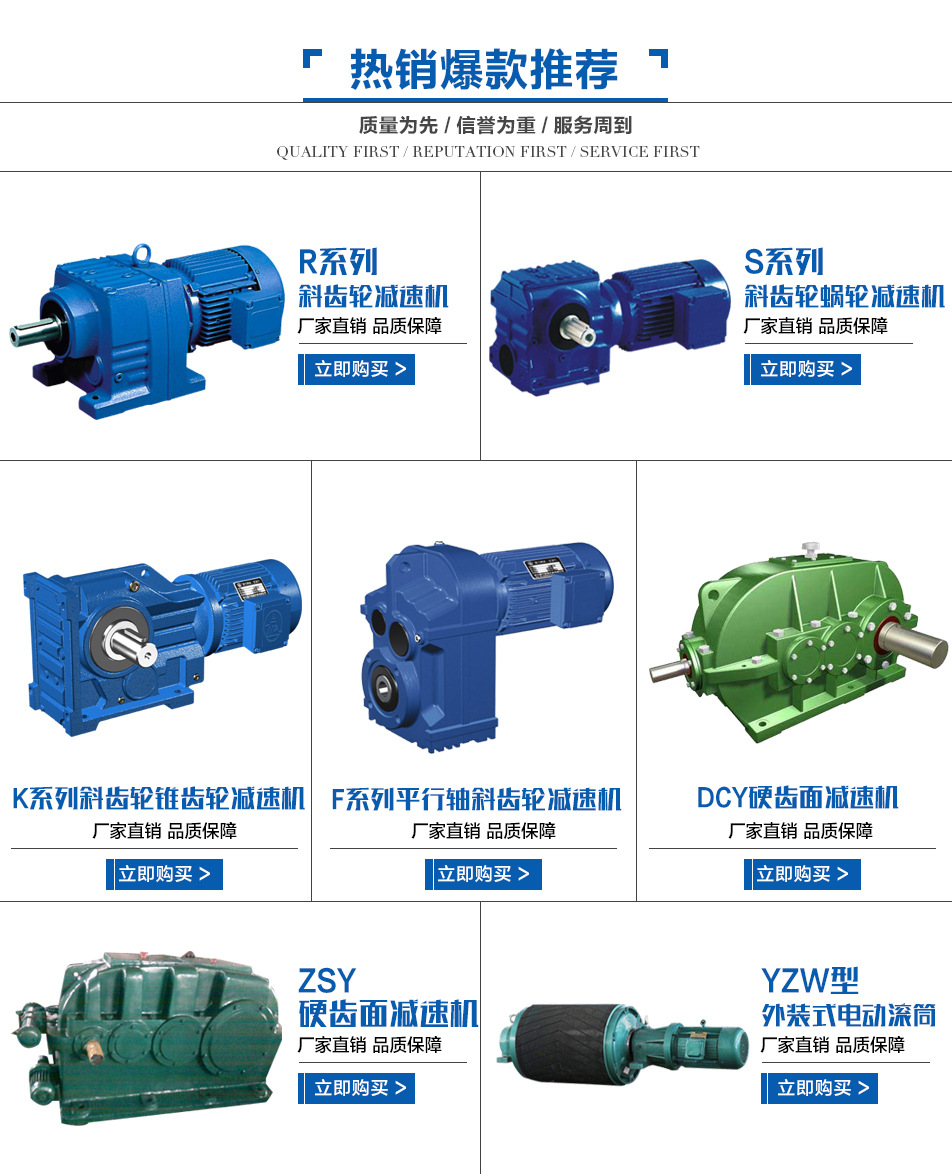 我廠主打產(chǎn)品為R、S、K、F系列斜齒輪減速機,ZSY、ZLYJ、ZD重型齒輪減速機,B、X系列擺線針輪減速機,WP、NMRV蝸輪蝸桿減速機,P系列行星減速機,TDY電滾筒及各種非標減速機.廣泛應用于制金.包裝,紡織,塑料機械,化工.電工機械等眾多行業(yè)。